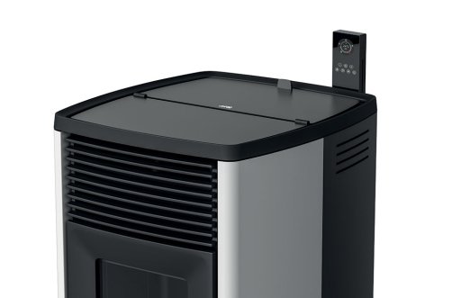 Hydro pelletkachel in staal, gecertificeerd met 5 sterren ariaPULITA, verkrijgbaar in 8 en 12 kW.